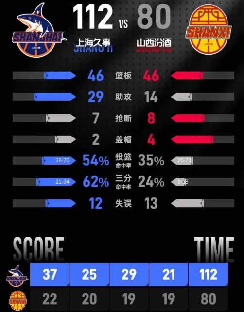 全场具体比分(山西汾酒队在后):37-22、25-20、29-19、21-19。