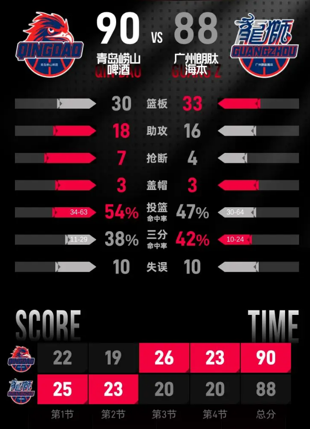 青岛崂山啤酒队:乔丹·米奇23分9篮板2助攻、奎因达里·韦瑟斯庞20分1篮板5助攻、王睿泽17分1篮板4助攻、吕俊虎11分5篮板、赵嘉义6分2篮板、王奕博6分2篮板3助攻、约瑟夫·杨5分2篮板2助攻、段昂君2分3篮板2助攻。