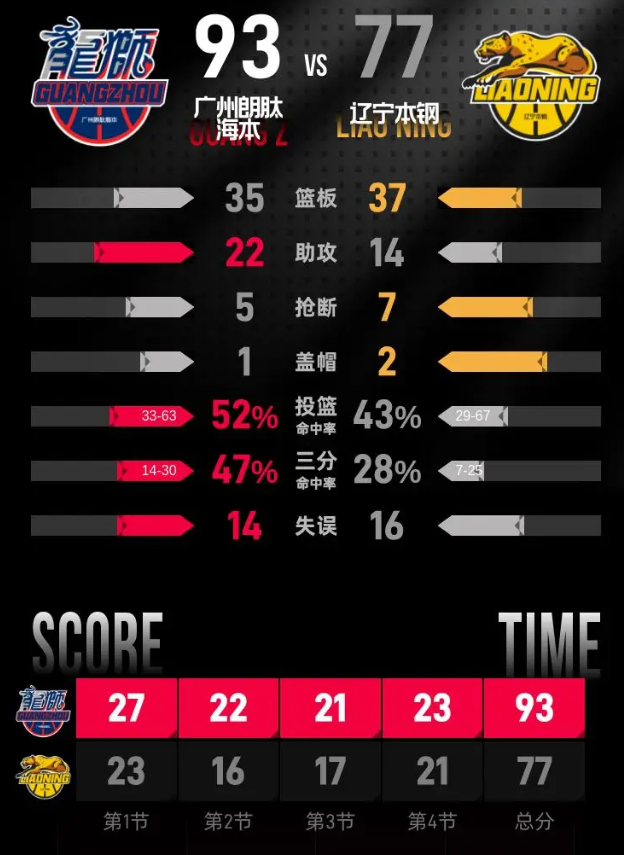 进入第四节,赵继伟开场命中三分,辽宁打出一波9-2的小高潮,布罗金顿连得5分,将分差缩小到4分。徐昕内线跳投命中打破得分荒,威金顿连续得分,刘颜诚接助攻三分命中,分差再次回到两位数。随后徐昕在内线连续得分,威金顿命中三分后将分差拉开到21分,辽宁无力缩小分差。最后阶段双方各有得分,广州主场稳稳守住优势,最终拿下比赛胜利。