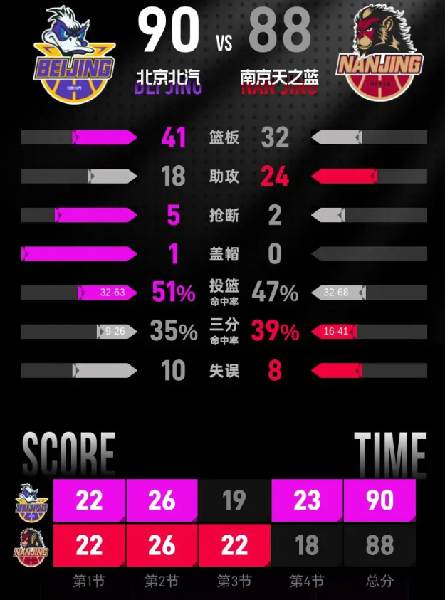 进入第四节比赛,汉兹开场连拿4分,邬挺嘉上篮得分,南京领先7分。周琦连续进攻取分,先是接助攻上篮,随后篮下得分加罚球,连拿4分追平比分。杰曼上篮得分帮助北京反超2分,杰克逊-卡特莱特跳投追平,赵睿命中三分再次超出,祝铭震回敬三分再次打平。杰曼上篮得分后两罚全中,翟晓川接周琦助攻跳投命中,北京领先6分。赵柏清罚球命中,杰克逊-卡特莱特上篮把分差缩小到3分,陈盈骏两罚全中,北京领先5分,比赛只剩8秒。祝铭震在终场前2秒接到助攻命中三分,最终北京北汽90-88带走胜利。