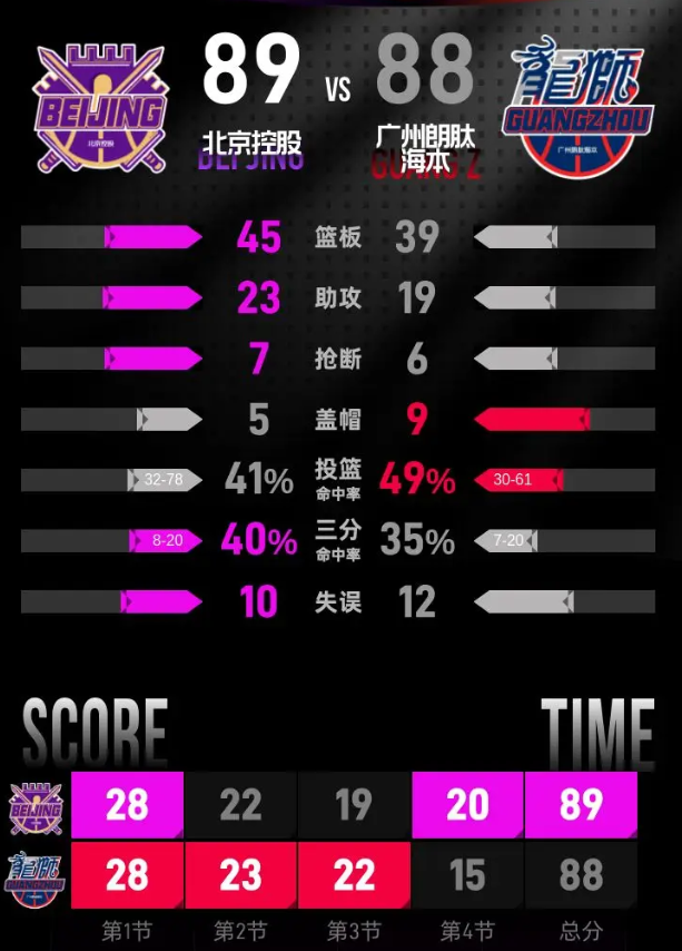 全场具体比分(北京控股队在后):28-28、23-22、22-19、15-20。
