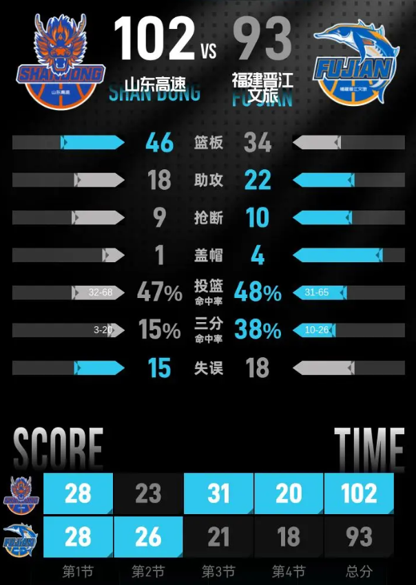 山东高速队:贝利·斯蒂尔24分7篮板、德沃恩·艾库恩-珀塞尔21分3篮板5助攻、陶汉林16分12篮板、郭凯14分6篮板1助攻、基昂泰·约翰逊12分4助攻、高诗岩7分2篮板4助攻、萨夏·琼斯4分5篮板、陈林坚2分1篮板、陈培东2分1篮板2助攻、谢智杰2篮板2助攻、于德豪2篮板。