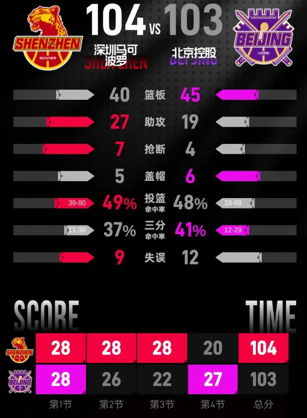 进入第四节比赛,深圳外线手感延续,卢鹏羽、王浩然接连命中三分,很快将领先优势扩大到14分,卢鹏羽再中三分后,深圳领先达到15分。里勒开启个人得分模式,连续飙中三记三分,接连突破上篮取分,短短几分钟里勒连砍14分,将分差缩小到4分。贺希宁四罚全中帮助深圳稳住优势,邹雨宸接里勒助攻飙中三分,里勒随后也再中三分,最后8秒里勒上篮帮助北控103-102反超比分。留给深圳8秒进攻时间,史密斯接李慕豪助攻跳投命中完成绝杀,深圳104-103拿下比赛。