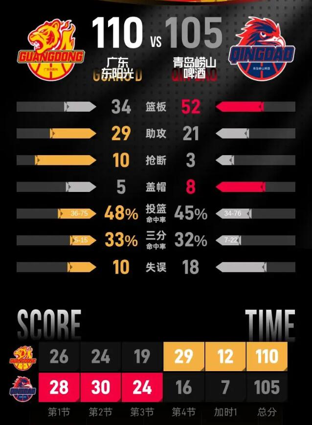 加时赛中,双方比分依旧紧咬,战成100平后麦考尔上篮打破平衡,王洪泽接助攻灌篮得手,胡明轩两罚全中后广东拉开6分优势。韦瑟斯庞最后关头连得5分,把分差缩小到3分,青岛采取犯规战术,奎因稳稳两罚全中,最终广东东阳光110-105击败青岛崂山啤酒。