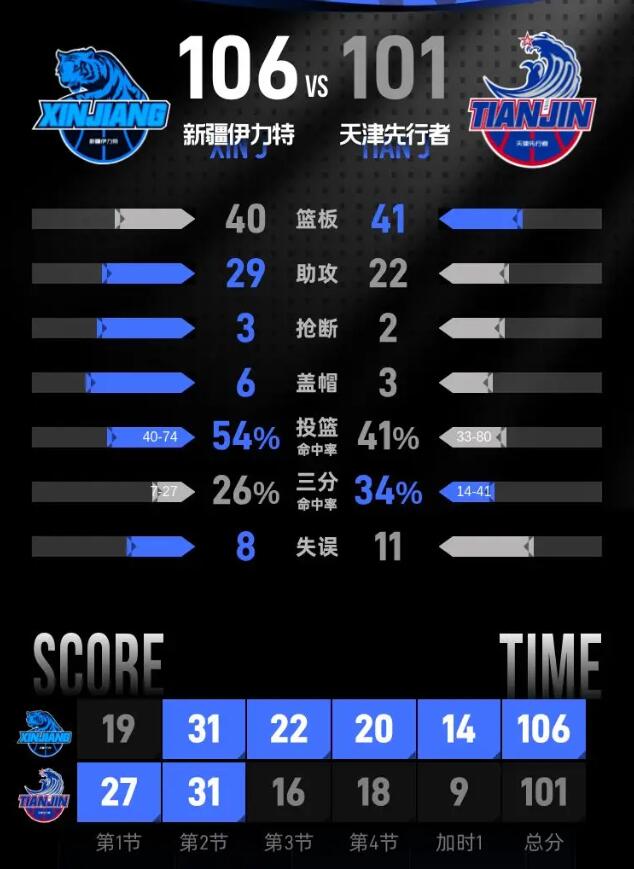 新疆伊力特队:齐麟25分7篮板2助攻、丹尼尔·布伊20分4篮板7助攻、阿不都沙拉木·阿不都热西提18分10篮板9助攻、扎卡里·纳托尔15分4篮板7助攻、冯傲12分3篮板1助攻、戴德里克·劳森9分5篮板2助攻、曲笑宇6分2篮板、塞缪尔·门内加1分、杨芮1篮板1助攻、葛浩然1篮板。