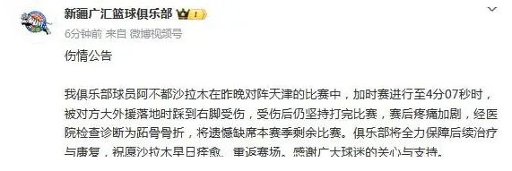 根据新疆男篮官方社交媒体的消息,球队核心球员阿不都沙拉木因跖骨骨折,将遗憾错过本赛季剩余比赛。