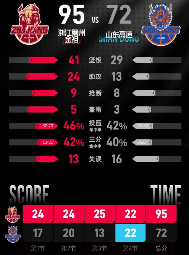 比赛进入末节,陆文博接助攻命中三分,高诗岩抛投得分回敬,李悦洲两罚全中后,吴前接李悦洲助攻投进三分,分差来到29分。珀塞尔接高诗岩助攻投进三分,琼斯内线跳投得分,王证上篮、高诗岩三分接连命中,山东不断缩小分差。琼斯稳定输出内线得分,吴前两罚全中,王证跟进三分命中,琼斯灌篮得分后吴前反击上篮,分差始终维持在20分以上。末节后半段,斯蒂尔连得4分,张洪硕灌篮得分后,斯蒂尔灌篮回敬,许梦君接助攻投进三分将比分追到72-93,周怡杉跳投命中,最终浙江稠州金租在主场以95-72击败山东高速。