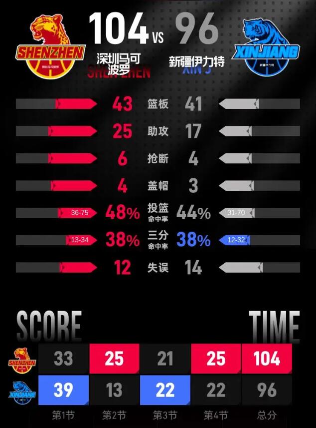 进入第四节,纳托尔手感爆发,连拿8分帮助新疆反超比分拿到2分领先。史密斯迅速回应三分,深圳重新夺回领先。随后深圳稳扎稳打,周鹏连续两记三分命中,将领先优势扩大到8分。新疆最后时刻尝试追分,殷召航上篮把分差缩小到7分,贺希宁罚球命中锁定比分,最终深圳客场104-96击败新疆。