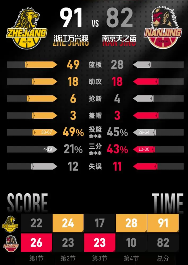 比赛进入末节,浙江队发起全面反击,赵嘉仁三分率先打开局面,胡金秋连续在内线得分,短短四分钟就把比分扳平。胡金秋命中三分反超后,双方战至77平,浙江队凭借内线优势连续拿分,逐步拉开分差。最后时刻卡特莱特两罚全中缩小分差,布朗两罚全中稳住局势,最终浙江客场以91-82击败南京。