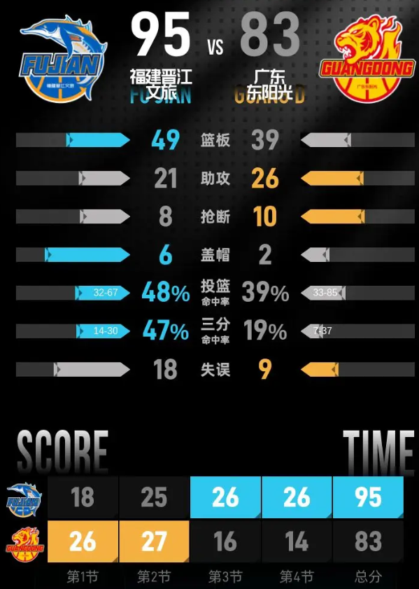 北京时间4月18日CBA常规赛第40轮,客场作战的福建晋江文旅以95-83击败广东东阳光,福建晋江文旅取得3连胜。邹阳20分10篮板0助攻,特雷维林·奎因31分9篮板5助攻。