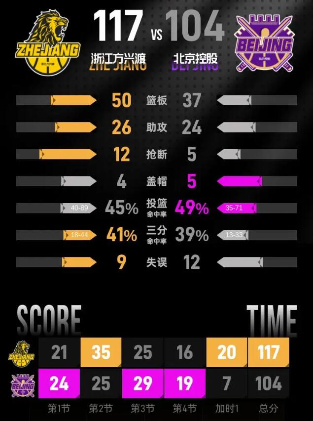 加时赛中,布朗完全接管进攻,开场就连得8分,其中包括两记三分,帮助浙江打出11-3的开局,一举将分差拉开到8分。此后浙江牢牢保持领先优势,林秉圣再中三分后,分差扩大到两位数。北控终场前追回两分,无力改写比分,最终浙江117-104拿下胜利。