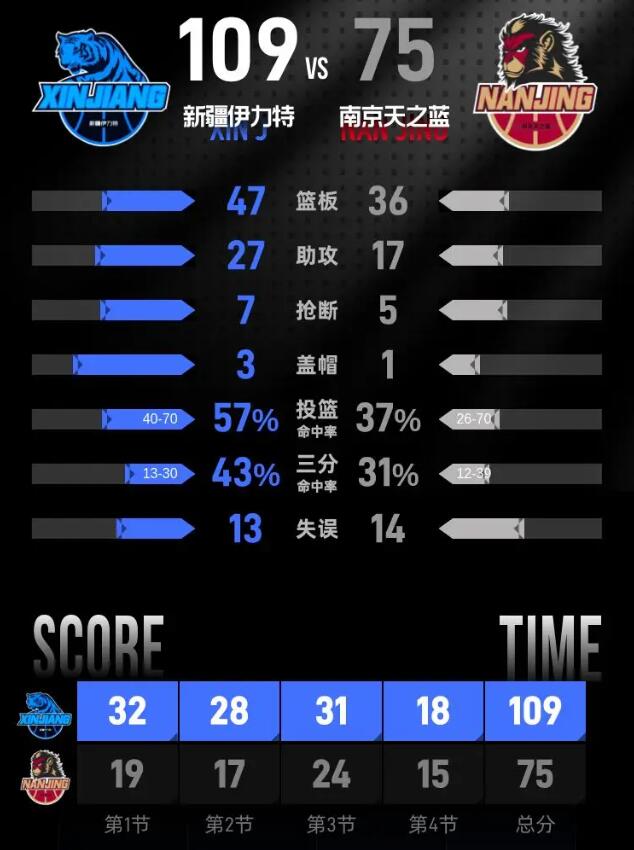 进入第四节比赛,分差已经超过30分,双方都换上替补阵容历练球员。冯傲连中两记三分继续扩大优势,马内克带动南京替补接连拿分,新疆轮换阵容也保持进攻节奏,葛浩然、杨芮先后命中三分进一步拉开分差。最后一分钟曲笑宇两罚全中,全场比分定格在109-75,新疆伊力特主场收获胜利。
