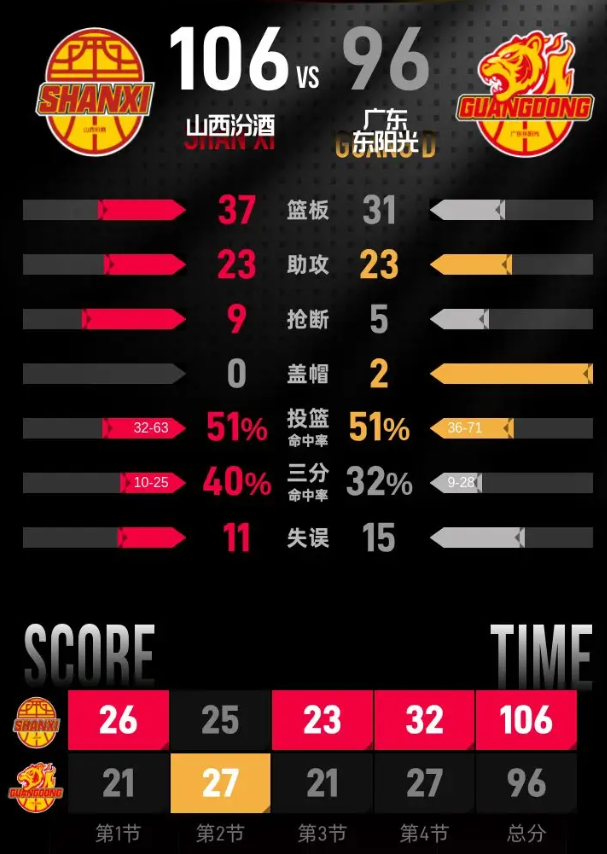 进入第四节比赛,奎因连续上篮得分缩小分差,焦海龙接助攻命中三分,帮助山西再次拉开分差。贾明儒接奈特助攻命中三分,分差来到两位数。杜润旺回敬三分把分差缩小到5分,张宁、贾明儒连续得分稳住局势。最后一分钟麦考尔连续得分追赶比分,将分差缩小到8分,山西稳稳罚中两球,最终以106-96击败广东。
