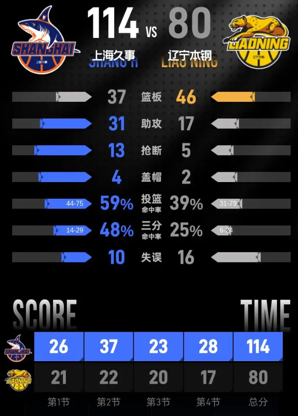 进入第四节,弗格开场连中两记三分,分差直接突破30分。大比分领先的上海换下全部主力,替补阵容依旧保持进攻状态,闫鹏飞两次罚球命中,刘铮跳投得分,崔晓龙连拿4分,辽宁抓住机会追回几分,刘铮再中三分后,袁堂文命中三分扩大优势,莱迪最后抛投得分,最终上海久事主场114-80击败辽宁本钢。