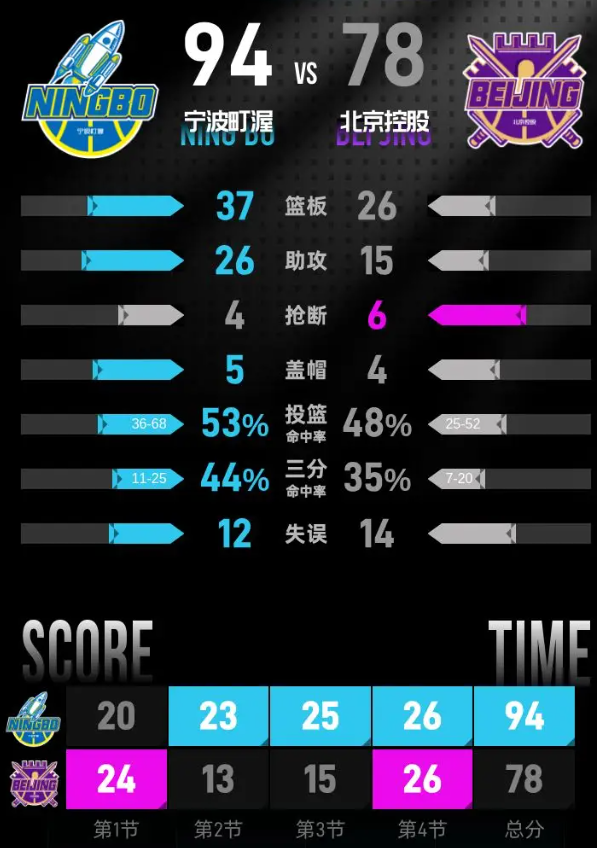 比赛进入末节,鲁吐布拉率先上篮得分,刘晓宇手感滚烫,接连命中三记三分,加上赵建树的三分命中,宁波打出14-4的攻击波,将分差拉开到26分,早早建立起绝对优势。大比分落后的北控没有放弃,豪斯连续命中三分,廖三宁多次突破上篮得分,逐步将分差缩小到16分。最后阶段戴昊接到助攻命中三分稳住局势,北控最后时刻连续上篮得分,依旧没能挽回劣势,最终宁波町渥在主场收下比赛胜利。