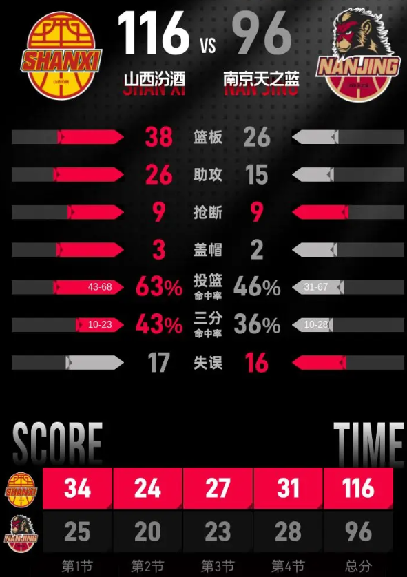 进入第四节比赛。尼克斯接助攻灌篮先拿两分,奈特连投带罚得到4分,焦海龙接助攻命中三分,分差突破20分。阿卜杜赛麦提命中三分,帕克接连命中三分和上篮,不断追赶比分,奈特保持进攻状态,连续拿分稳住领先优势。卢骏跳投三分命中后,山西领先优势回到21分,南京后续连续得分把分差缩小到16分,无力进一步缩小差距。最后卢骏接刘东助攻上篮得分,全场比分定格为116-96。