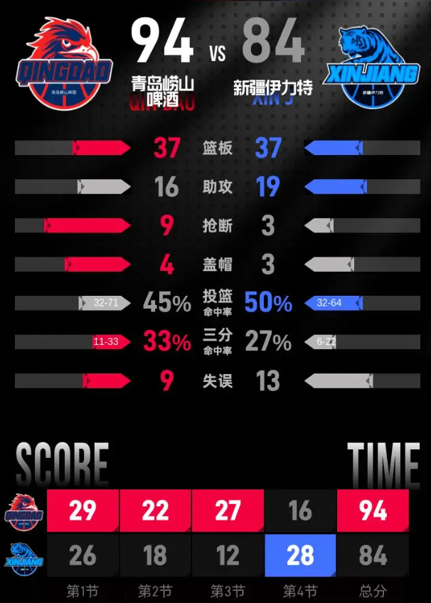 第四节开始后,落后的新疆队发起反扑,布伊、曲笑宇连续取分,打出一波17-3的攻击波,将分差缩小到12分。王奕博命中三分稳住局势,布伊多次罚球得分继续追赶,分差一度缩小到9分。吕俊虎接助攻命中三分,再次将分差拉回14分。最后一分钟奎因奥内斯两罚全中,杨芮接到布伊助攻命中三分,全场比分定格在94-84,青岛主场拿下胜利。