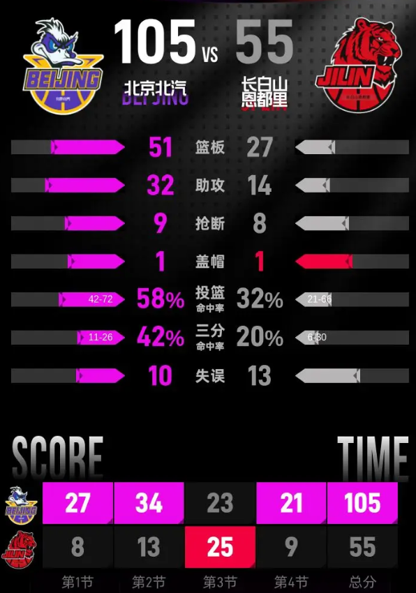 北京北汽进攻端火力全开,建立起40分的巨大领先优势,长白山恩都里进攻端命中率低迷,难以缩小分差。