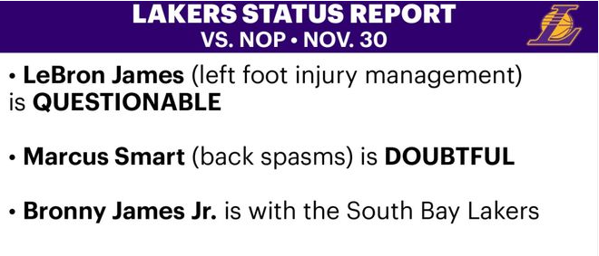 北京时间11月30日,湖人更新了明天对阵鹈鹕的伤病报告,詹姆斯(左脚伤病管理)被列为出战成疑(上场可能50%),斯马特(背部痉挛)是大概率缺阵(上场可能25%),布朗尼下放发展联盟,确定不会出战比赛。