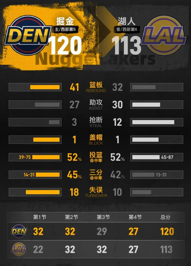 全场具体比分(掘金队在后):22-32、32-32、32-29、27-27。