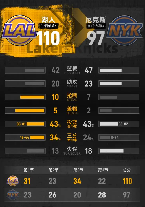 全场具体比分(湖人队在后):23-31、26-23、20-34、28-22。