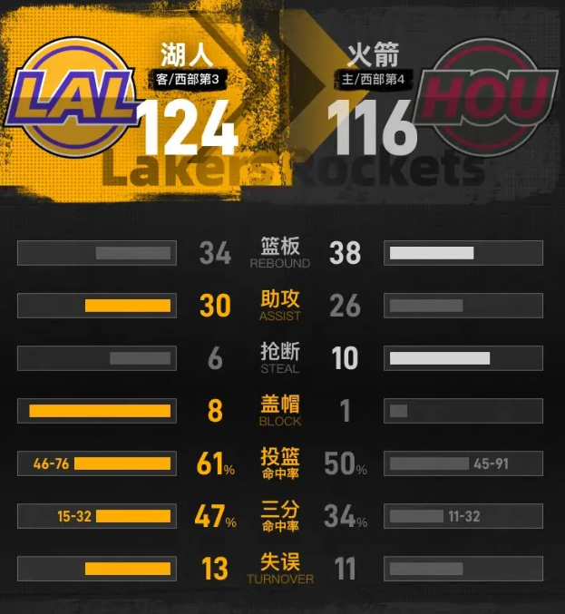 次节比赛,湖人延续进攻状态,拉拉维亚命中三分后詹姆斯两次篮下进攻得手,湖人一度把分差拉开到13分。申京带动火箭队友连续取分,史密斯命中三分后不断缩小分差,半场结束前东契奇突破得分再加罚,湖人以67-55保持领先。