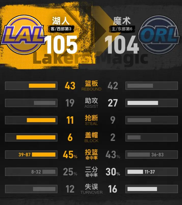 北京时间3月22日NBA常规赛,客场作战的湖人以105-104击败魔术,魔术遭遇4连败,湖人取得9连胜。东契奇33分5篮板8助攻,班凯罗16分5篮板6助攻。