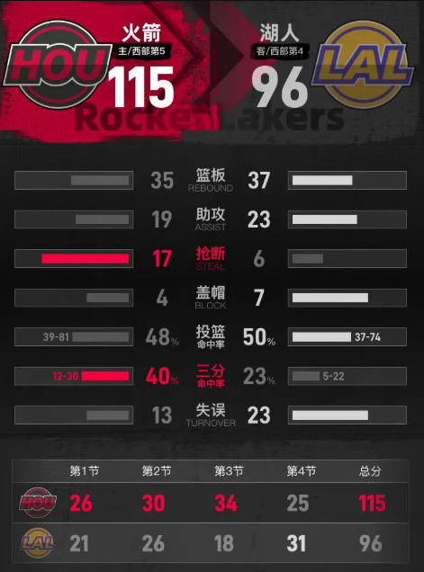 全场具体比分(火箭队在后):21-26、26-30、18-34、31-25。