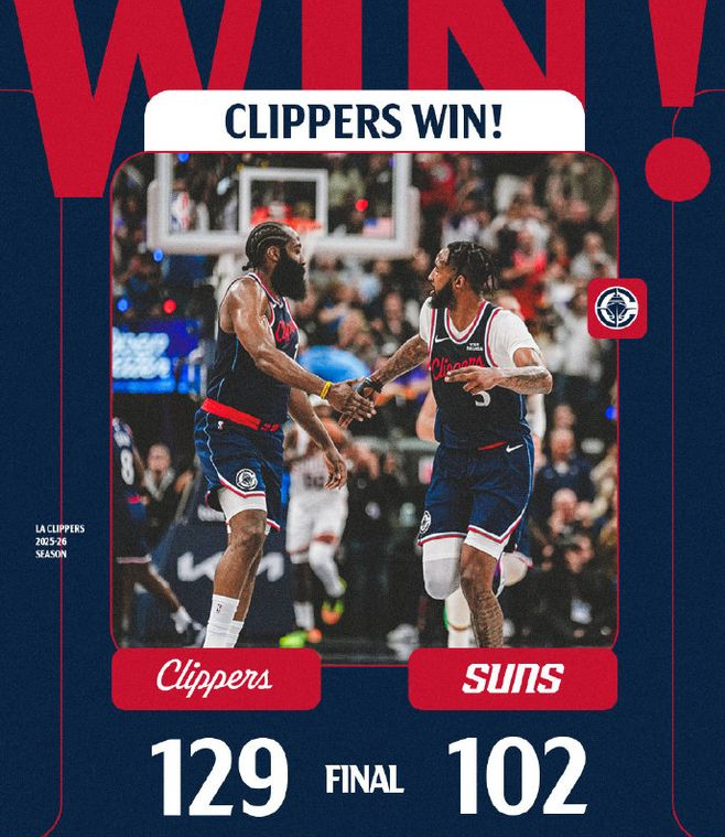 快船大胜太阳获首胜 哈登30+7+7!小卡27+5+5狄龙21分