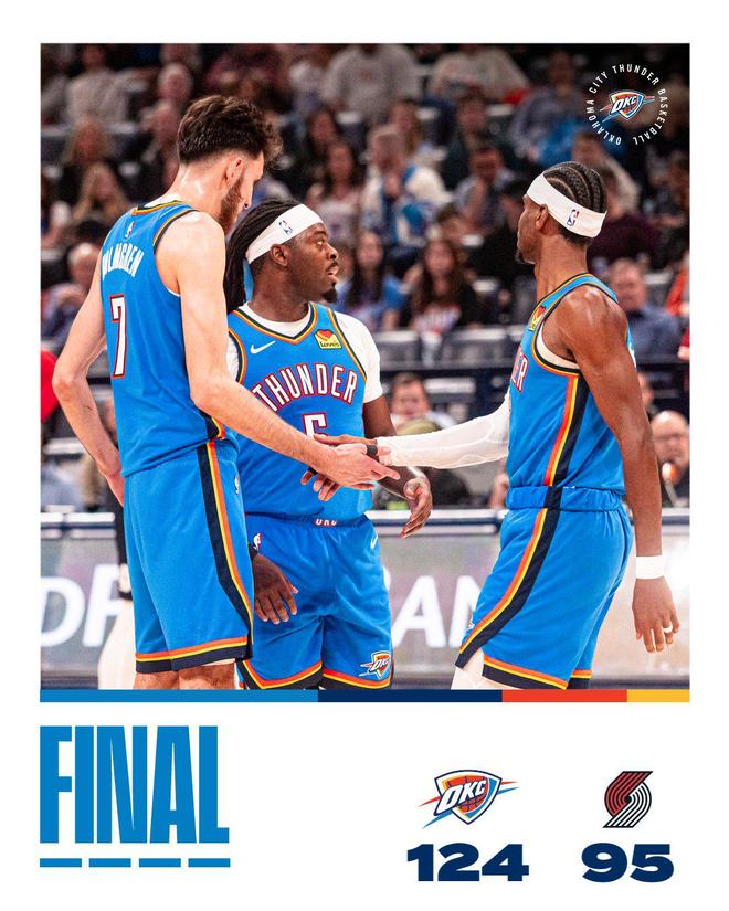 NBA常规赛继续进行,波特兰开拓者队(14胜20负)结束连胜。亚历山大得到30分,他率队7人得分上双,俄克拉荷马城雷霆队(29胜5负)前三节逐渐确立大比分优势,他们在主场以124-95大胜开拓者队。雷霆队拿到3连胜,开拓者队结束2连胜。杨瀚森替补得到3分和5个篮板。