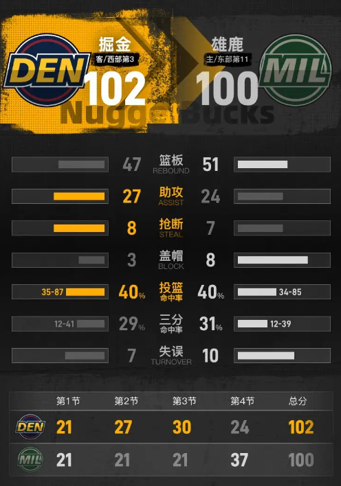最后一节,雄鹿的表现相对低迷,最大时落后达到23分。尽管在中段奋起反击,将差距缩小至1分,但掘金依然保持着进攻的火力,进入本节末段时优势明显。雄鹿的罗林斯在本节贡献15分,包括3记三分,而掘金的哈达威也表现出色,获得10分,其中有2记三分。最终,掘金以102-100赢下比赛。