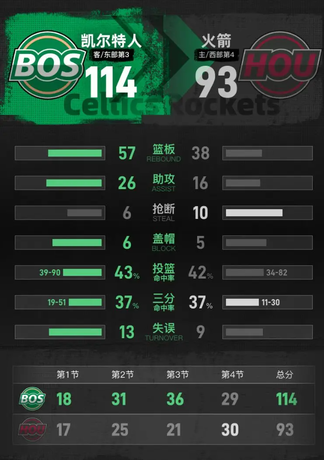 第四节,火箭再次努力缩小劣势,将分差缩至69-89,然而凯尔特人在进攻端非常犀利,迅速将分差扩大至29分。尽管火箭在小节后段再次缩小了分差,凯尔特人的普理查德则在此节中表现不俗,贡献11分,包含3记三分球。最终,凯尔特人以114-93赢下了本场比赛。