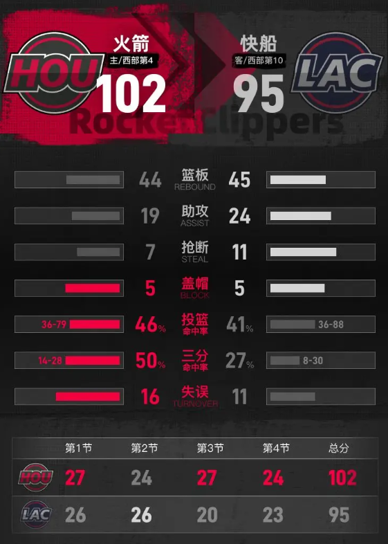 第四节,火箭在开始阶段迅速进入状态,打出了一波强势进攻,迅速将领先优势扩大到15分。尽管快船在小节后段开始发力,努力追赶,但火箭始终保持着优势。最终,第四节结束时,火箭以102-95赢得了比赛。