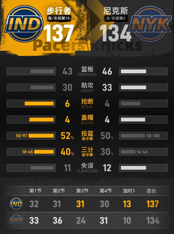 第一个加时赛的开始,步行者率先发起猛攻,将分差迅速扩大至9分。虽然尼克斯在小节后段顽强追赶,将比分逐步拉近,但最终未能逆转局势。比赛结束时,步行者以137-134赢得胜利。