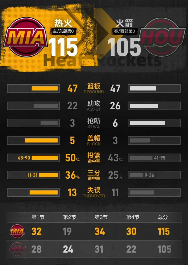 第四节,热火开局手感不佳,双方分差一度缩小至0分。随着比赛的进行,热火找回状态,通过一波进攻将优势扩大至12分。虽然火箭队在小节后段紧追不舍,试图缩小分差,但未能改变战局。本节,热火的拉尔森表现突出,得到10分,其中包括1记三分球。最终,热火以115-105赢下比赛。