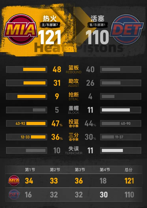 北京时间3月9日NBA常规赛,主场作战的热火以121-110击败活塞,热火取得5连胜,活塞遭遇4连败。希罗25分6篮板3助攻,坎宁安26分1篮板10助攻。