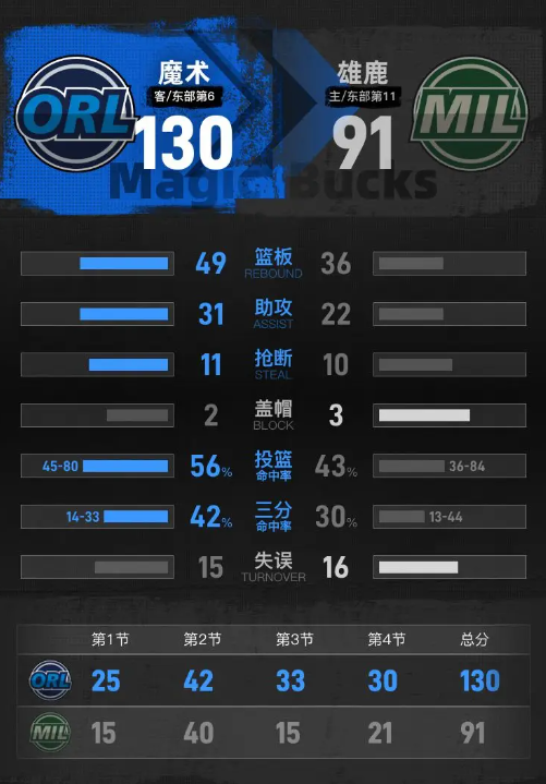进入第四节,早早建立大比分优势的魔术换下全部主力,双方替补阵容出战。罗林斯连续拿到5分,杰克逊命中三分,南斯空切扣篮,魔术替补也保持着稳定进攻火力,比塔泽、贾马尔-凯恩连续得分,分差一度扩大到38分。末段特伦特命中三分,阿德托昆博扣篮得分,霍华德两罚全中定格比分,最终魔术客场130-91大胜雄鹿。