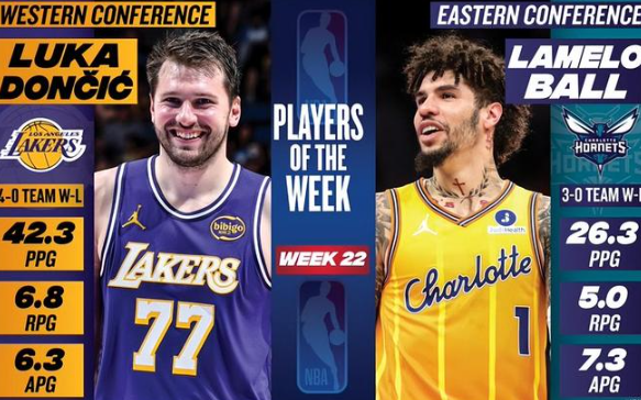 北京时间3月24日,NBA官方公布了第22周的周最佳球员,湖人球星卢卡-东契奇当选西部周最佳,黄蜂球星拉梅洛-鲍尔(三球)当选东部周最佳。哈登、阿门、文班亚马等球星获得提名。