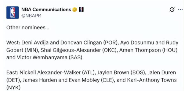西部:阿夫迪亚和克林根(开拓者)、多森姆和戈贝尔(森林狼)、亚历山大(雷霆)、阿门-汤普森(火箭)、文班亚马(马刺)