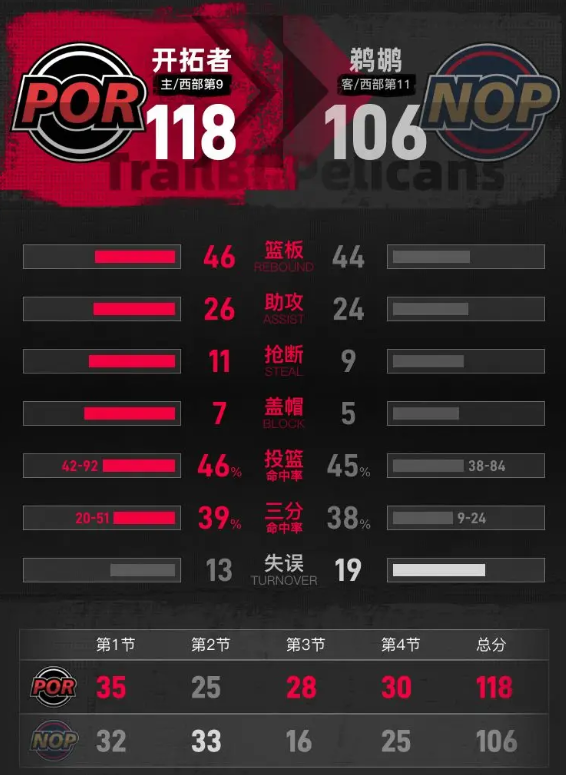 进入第四节比赛,费尔斯连续得分帮助鹈鹕缩小分差,一度把分差追到3分。塞布尔三分命中重新拉开差距,霍勒迪外线接连命中三分,阿夫迪亚也多次通过罚球和突破巩固领先优势。比赛最后1分21秒,霍勒迪再中三分,分差拉开到11分。琼斯两罚全中后,阿夫迪亚稳稳两罚全中,最终开拓者主场118-106击败鹈鹕。