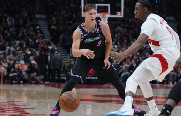 热火队首发:安德鲁-维金斯、泰勒-希罗、戴维恩-米切尔、巴姆-阿德巴约、佩勒-拉尔森